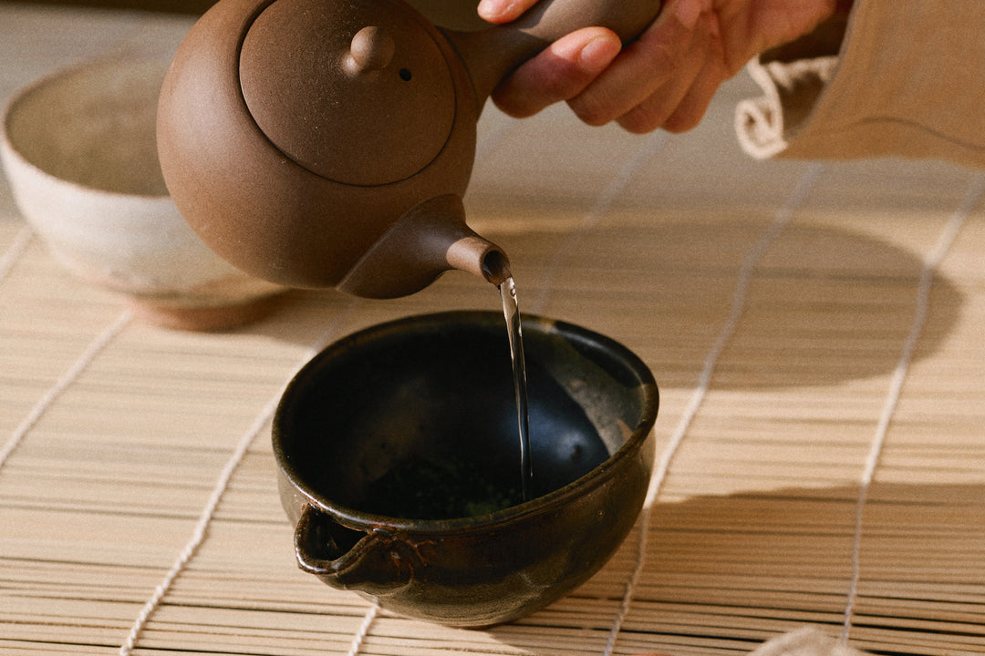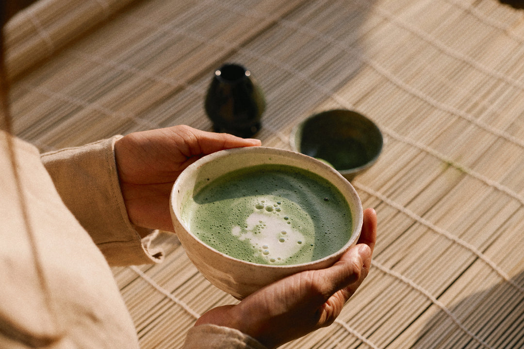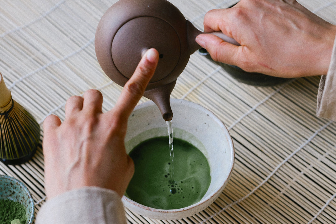 Pour about 60–80 ml of hot water (around 60-70 degrees, not boiling) over the matcha.